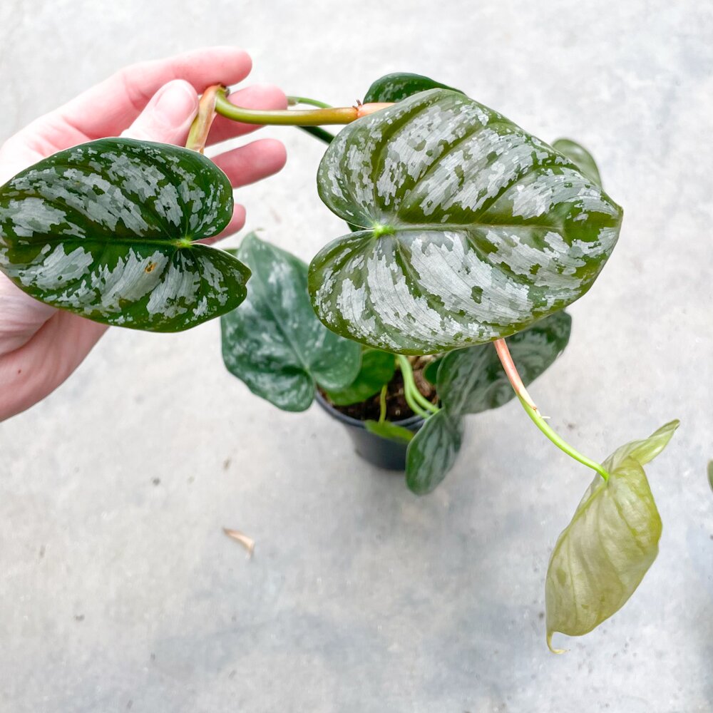 A refined climbing philodendron with elongated olive-green leaves brushed in soft silver, giving it a subtle, almost metallic look.