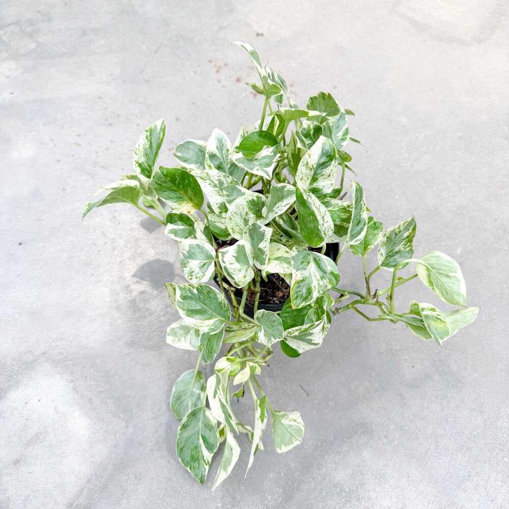 Pothos ‘N’Joy’ is compact, bright, and beautifully crisp. Its smaller, heart-shaped leaves are boldly variegated with creamy white and deep green, creating sharp contrast along tidy trailing vines. Compared to larger-leaf varieties, ‘N’Joy’ stays a little more refined and controlled—perfect for shelves, desktops, or tighter spaces.